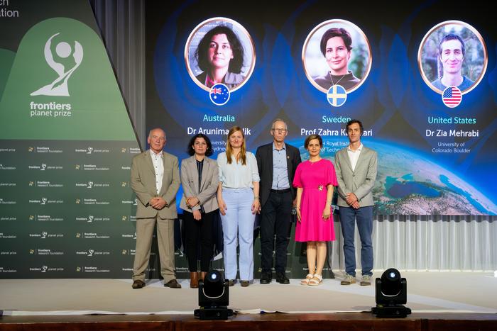 Left to right: Prof Jean-Claude Burgelman, Director, Frontiers Planet Prize; Dr Arunima Malik, Frontiers Planet Prize 2025 International Champion, Australia; Dr Kamila Markram, Co-founder and CEO, Frontiers, and Vice-President, Frontiers Research Foundation; Prof Dr Johan Rockström, Chair of the Jury 100, Frontiers Planet Prize; Director, Potsdam Institute of Climate Impact Research; Prof Zahra Kalantari, Frontiers Planet Prize 2025 International Champion, Sweden; Dr Zia Mehrabi, Frontiers Planet Prize 2025 International Champion, USA