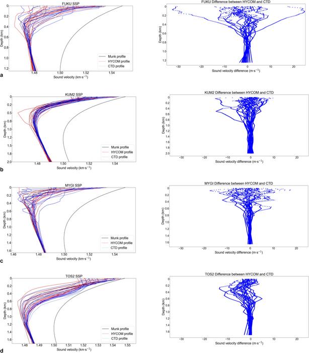 Comparison of the in situ profile, HYCOM profile, and Munk profile sound speed at the four sites FUKU a, KUM2 b, MYGI c, and TOS2 d.