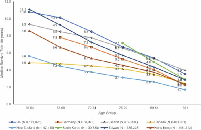 The image shows the median number of years people lived after being diagnosed with dementia, shown by age group and country.