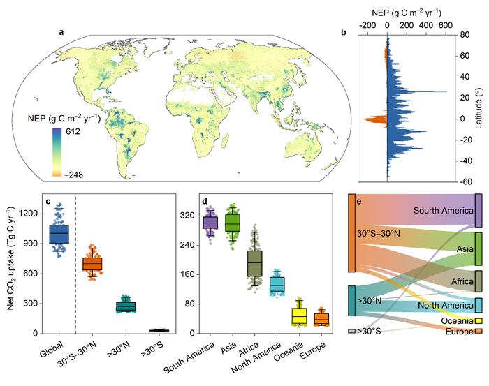 The researchers compiled 934 in situ observations from 258 peer-reviewed publications and the FLUXNET database to estimate a global mean wetland net ecosystem production (NEP) of 56.4 g C m‒2 year‒1. By integrating the NEP dataset with environmental datasets and machine-learning models, they estimated a mean annual global wetland C sequestration of 1,004 Tg C for the period 2000–2020, with 70% contributed by tropical wetlands.