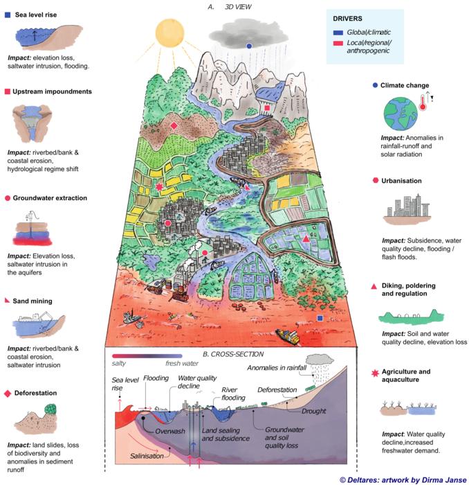 While climate change threatens the world’s deltas, anthropogenic drivers - largely reflected in sediment starvation and resource extraction, profound land-use change and hydrological regime shifts - can outpace climate change in the short to medium term.