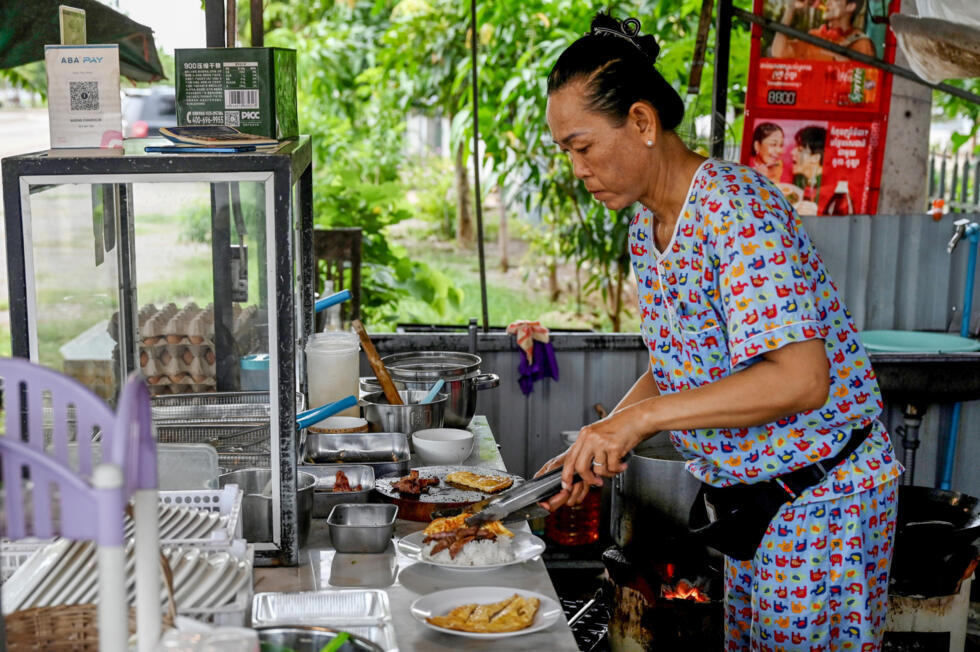 Soeung Chhivling prepares food for customers at her restaurant in Samraong, around 20 kilometres from the border conflict zone © TANG CHHIN Sothy / AFP
