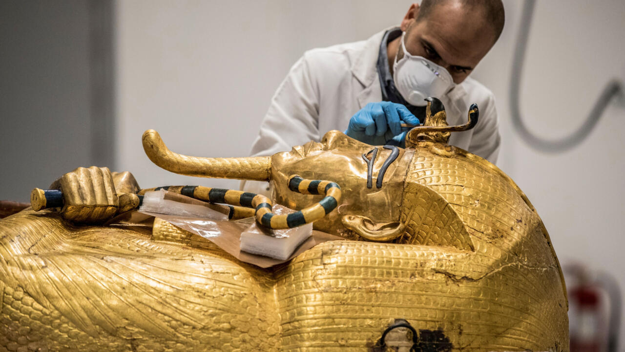 An archaeologist performs restorations on the sarcophagus of Pharaoh Tutankhamun in the restoration laboratory of the Grand Egyptian Museum in Cairo, Egypt, in 2020. © Khaled Desouki, AFP