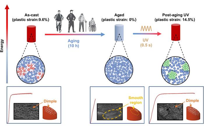A research team led by Jiang Ma from Shenzhen University, China, has developed a novel technique to enhance the plasticity of metallic glasses. By leveraging a combination of controlled aging processes and ultrasonic vibrations, they have demonstrated the ability to reverse aging-induced property deterioration and significantly improve the capacity of these glasses to deform without breaking. The team demonstrated that aged samples completely lose their compressive plasticity, whereas UV treatment after aging not only restores it but enhances the plasticity beyond that of the as-cast one.