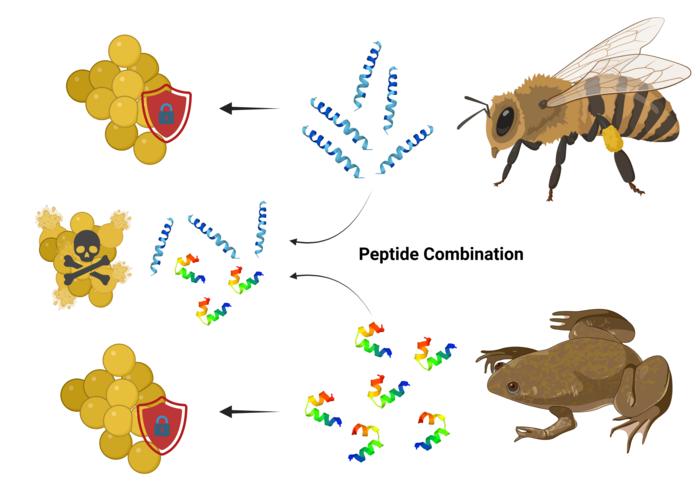 The figure illustrates a key strategy to prevent the evolution of antimicrobial resistance. When bacteria are treated with a single antimicrobial peptide (AMP)—from a source like a honeybee (top) or a frog (bottom)—they can rapidly evolve resistance, which renders the treatment ineffective. However, when the bacteria are treated with a combination of different AMPs, they are effectively killed (center), and their ability to evolve resistance is significantly hindered. This approach makes peptide combinations a promising strategy for developing more durable, 'resistance-proof' therapies.