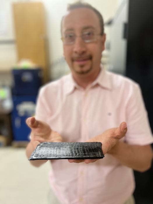 Dr. Mohammad Naraghi showcasing ATSP, the carbon-fiber smart plastic.