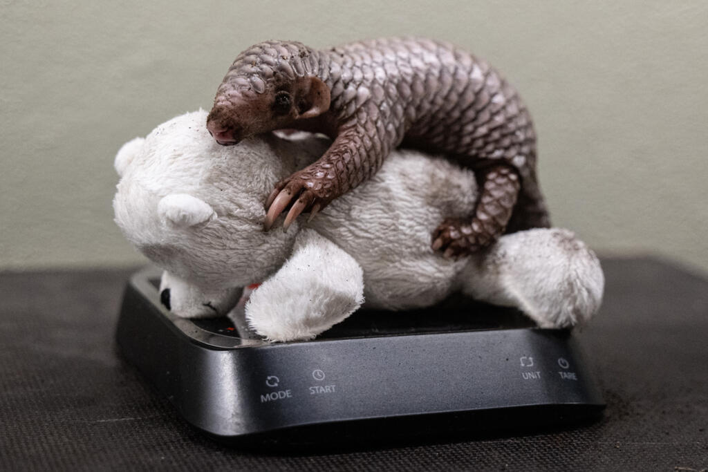 A baby Chinese pangolin on a weighing scale at Prague Zoo.