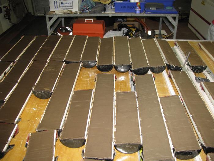 Red-brown clays recovered from deep sea sediment cores in the Pacific Ocean.