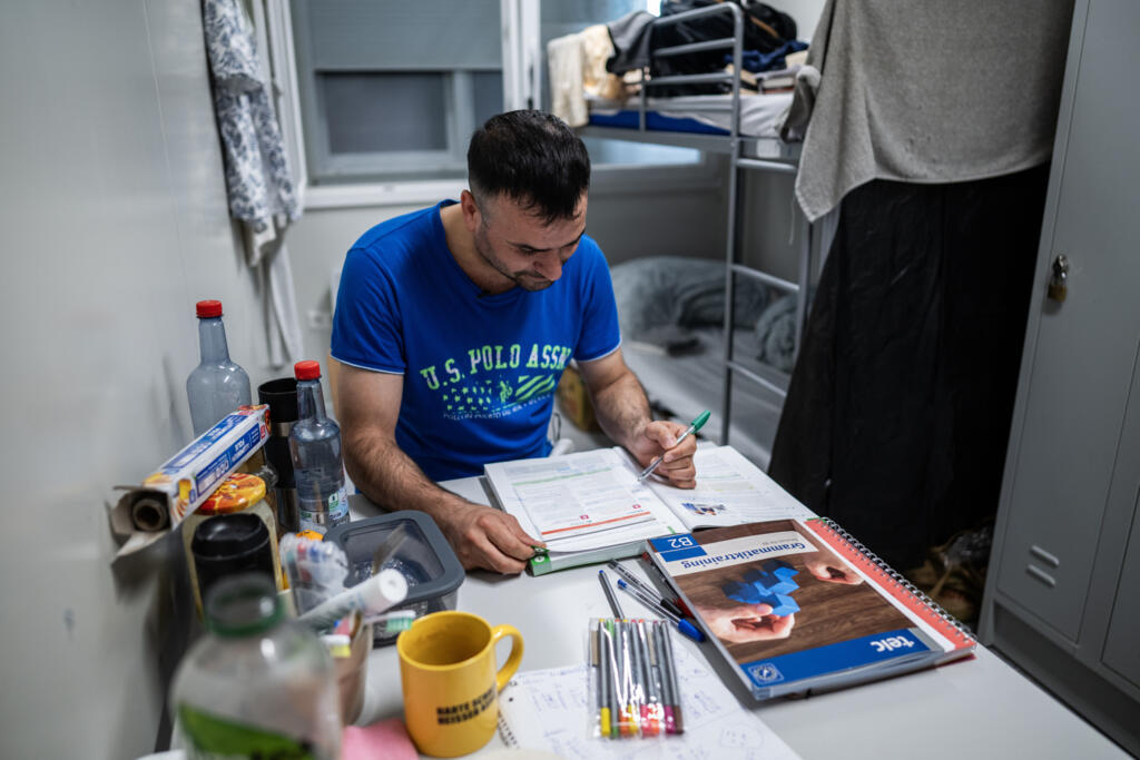 Kurd Faruk Polat, 34, works on his German in his overcrowded shelter in Berlin's former Tempelhof airport © John MACDOUGALL / AFP