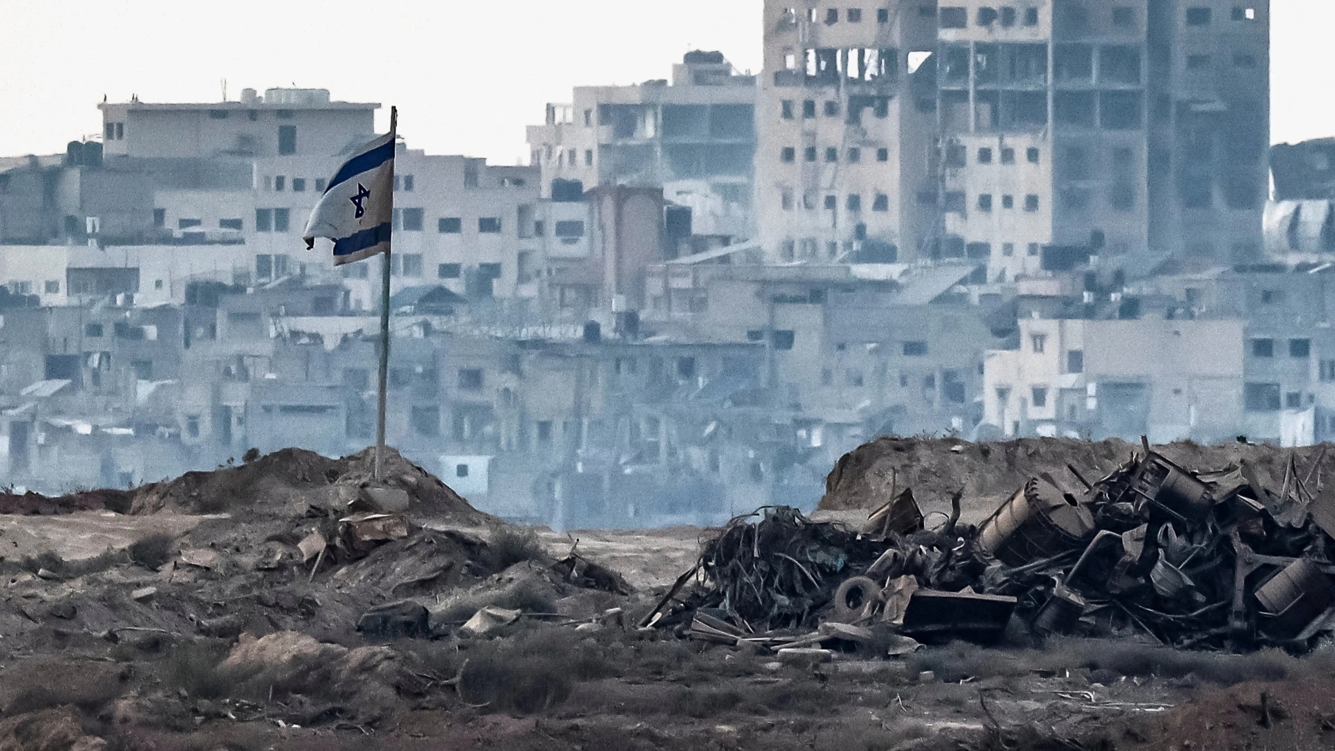 A damaged Israeli flag flies in Gaza, as seen from Israel on August 7, 2025
