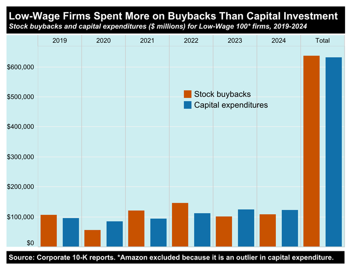 At 56 Low-Wage 100 companies, outlays for stock buybacks actually exceeded capital expenditures between 2019 and 2024. If we exclude Amazon, a CapEx outlier, the Low-Wage 100 as a whole spent considerably more on buybacks than on capital expenditures over this six-year period.
