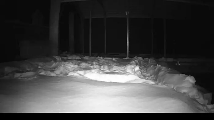 Three North American river otters play in the snow on the docks of the Smithsonian Environmental Research Center. Detected with SERC’s night-vision wildlife cameras.