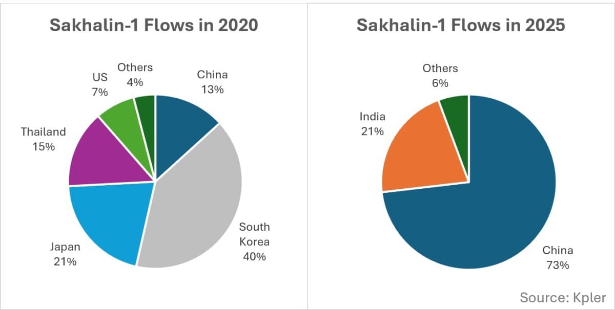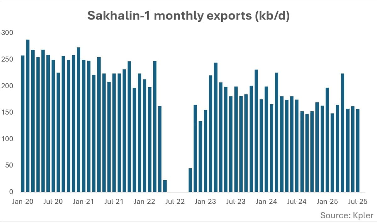 Exports also crashed. Annual shipments of Sakhalin-1 crude fell from 229,000 b/d before the war to 98,000 b/d in 2022, according to Kpler data. For four straight months — June through September — no exports left the terminal. Flows later recovered to 198,000 b/d but still have not reached the pre-war volumes, as sanctions complicated logistics and buyers grew more cautious. Before 2022, the crude had a diverse customer base, including South Korea, Japan, Thailand, China, and even the United States. By 2023, only India and China remained, with a small volume reaching Pakistan in 2024. Today, China has emerged as the largest buyer, taking in 118,000 b/d in 2025 to date.