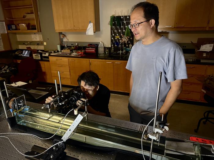 The shape of water can help researchers manipulate how much energy flows through a barrier. Likun Zhang (right) senior scientist at the National Center for Physical Acoustics, and Zhengwu Wang, a doctoral student in physics, take photos of the water passing through a barrier while manipulating the angle of the water’s meniscus, the curve caused by surface tension near barriers.