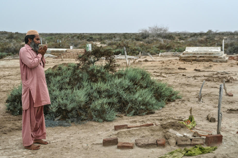 Habibullah Khatti bids a final goodbye to his mother's grave before he abandons his parched island village on Pakistan's Indus delta © Asif HASSAN / AFP