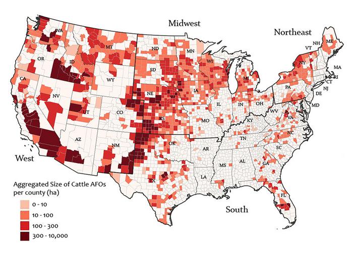 Research from the University of Michigan has revealed the location and extent of more than 15,000 hog and cattle feeding operations in the United States. This map shows how much area cattle feeding operations occupy in each county. These operations occupy an area equivalent to nearly 400,000 football fields nationwide.