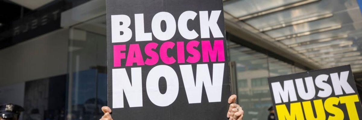 A protestor outside a Tesla showroom in Manhattan holds a sign that reads "Block fascism now."