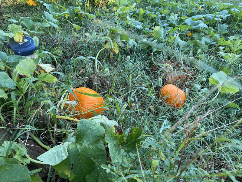 In May, Jill planted pumpkin seeds, and so we have about 10 to 15 orange orbs floating in a sea of huge, lily-pad-shaped leaves. The cool nights are already causing the leaves to turn a little yellow around the edges. Soon, we will begin picking the pumpkins, as many have a withered, dry stem – a sign it is time to harvest. We will store them on cardboard, in a cool dark place – bottom or stem-side up, and I imagine that we will find a child or two to bestow some on.