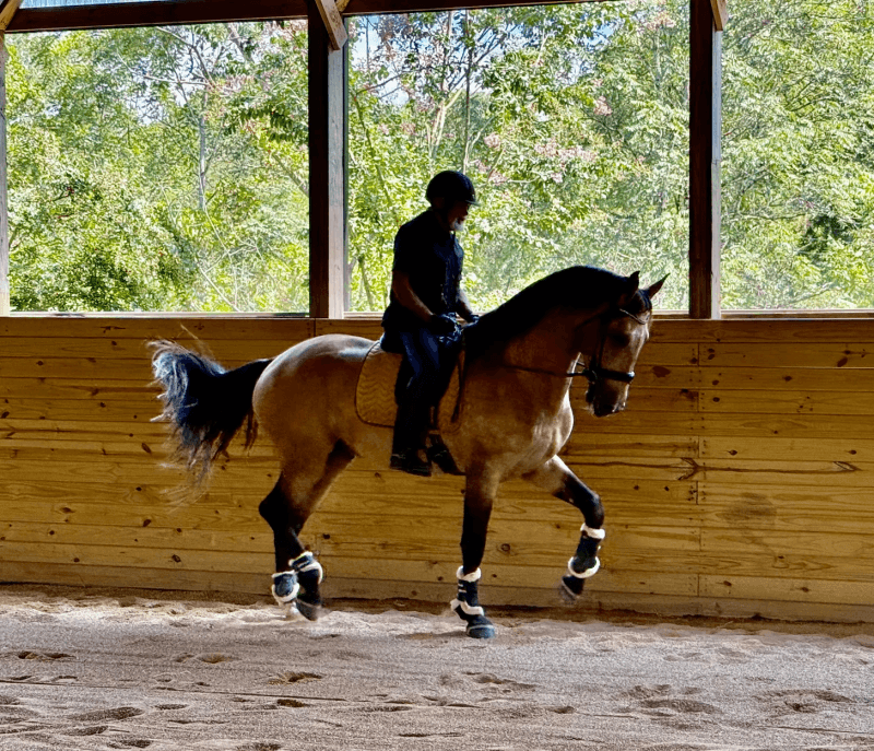 In other farm news, Quartz – our five-year-old Lusitano stallion- came home for a week while his trainer was traveling. Jill wrenched her back temporarily, and so her dreams of riding him each day were dashed. So, I volunteered and…fell in love. This young horse has all the makings of a dressage champion, and I am excited to say that I will be a big part of that journey.