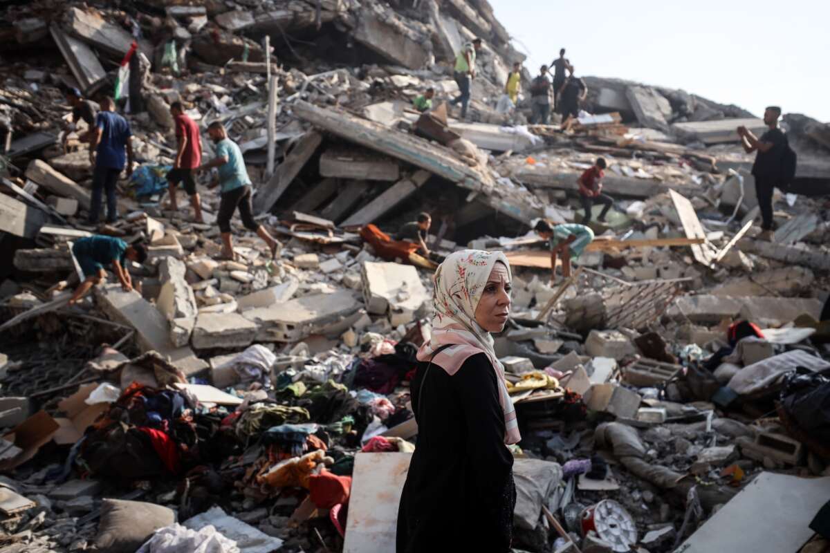 Displaced Palestinians gather in front of the rubble of a building, leveled in an overnight Israeli strike that also damages the surrounding tents used as temporary shelters, in the Rimal neighborhood of Gaza City, on September 15, 2025.Majdi Fathi / NurPhoto via Getty Images