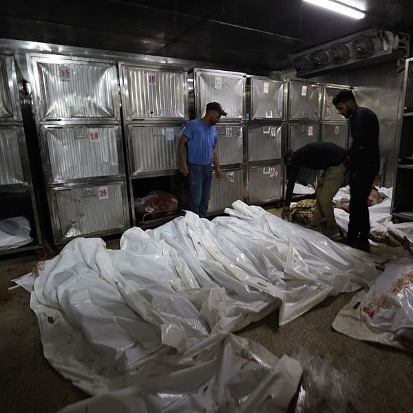 The bodies of victims of an October 31, 2023 Israeli bombing of the Jabalia refugee camp in the Gaza Strip are lined up outside the Indonesian Hospital in Gaza City.