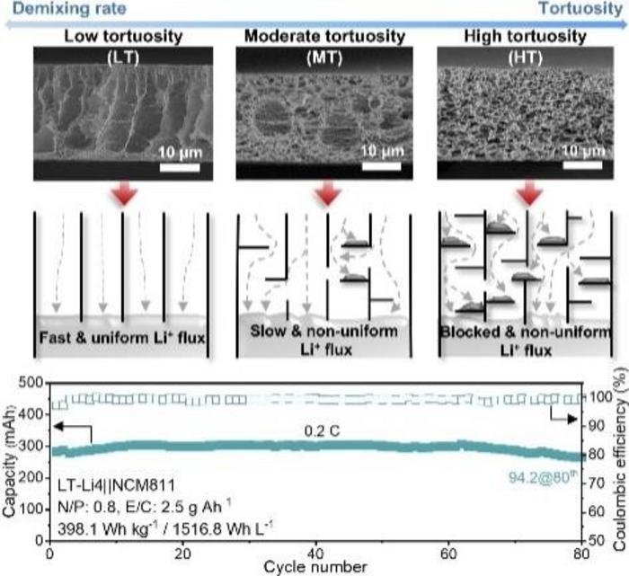 The team’s solution is simple yet effective: they engineered a porous host structure with straight, low-tortuosity channels and a built-in lithiophilicity gradient enabling uniform lithium deposition from the bottom up. Think of a parking garage: if the entrance is narrow and lanes are winding, cars tend to bunch at the entrance. But if you build wide straight ramps and make lower floors more spacious, vehicles naturally fill the lower floors first. Their electrode design applies this principle to lithium ions in the battery.