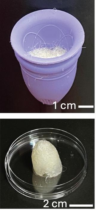 To prepare a proof-of-concept for commercialization, they also pressed and cut the fibers into teardrop-shaped tablets that fit inside the menstrual cups. Next, they will test the feasibility of mass-producing these alginate fibers, and the flushability of the liquid-soaked absorbent tablets.