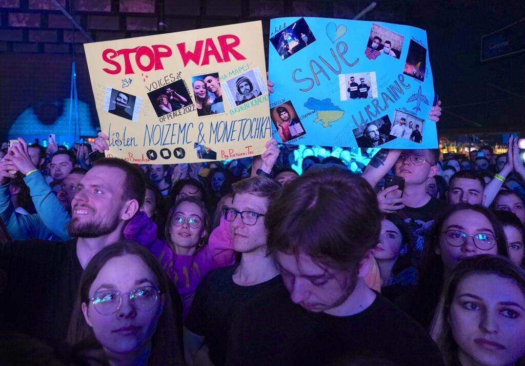 Fans held up anti-war posters during a 2022 concert of pop icon Monetochka and rapper Noize MC © JANEK SKARZYNSKI / AFP