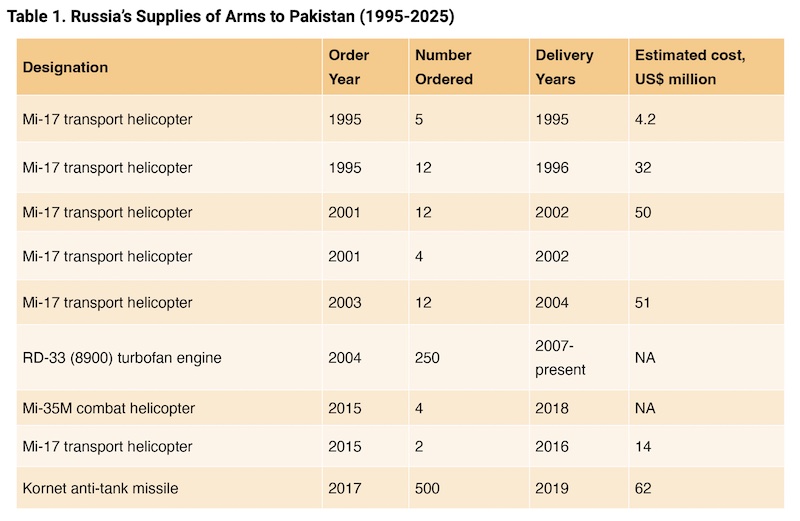It is important to consider these arguments in context. This debate dates back to the 1990s when Moscow was on the verge of providing Pakistan with Su-27s. Despite strong lobbying from the foreign ministry and a general warming of Russia-Pakistan political ties, the deal was eventually abandoned. This was followed by further discussions, fuelled by Pakistan’s desire to purchase various defence platforms from Russia, including air-to-air missiles, tanks, stealth frigates, and artillery guns. Most of these Pakistani proposals led nowhere and were blocked by Russia due to Indian objections. What did materialise, however, was the Russian provision of Mi-17/171 dual-use transport helicopters, which were delivered to Pakistan in several batches between 1996 and 2016, as well as four Mi-35M combat helicopters (Refer to Table 1).