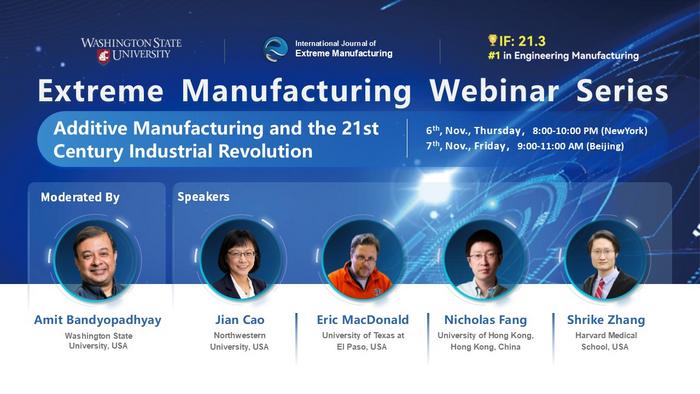 On 8:00 PM (EST) November 6, 2025, leading scientists from across the globe will gather online for the Extreme Manufacturing Webinar Series on "Additive Manufacturing and the 21st Century Industrial Revolution". The event brings together four pioneering researchers whose work is pushing the boundaries of what can be made—and how fast, sustainable, and intelligent manufacturing can become.