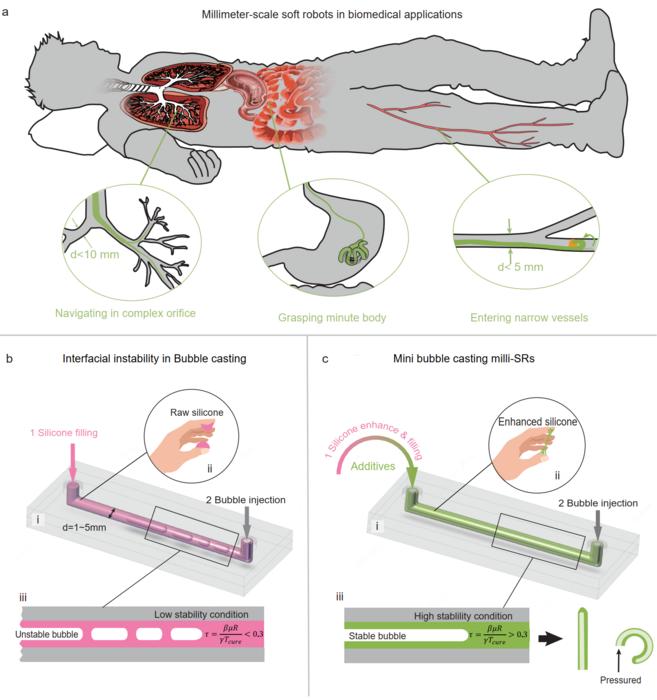 (a) Milli-SRs perform biomedical tasks in narrow human cavities—like navigating complex orifices, removing foreign objects, and entering tiny vessels. (b) Bubble casting struggles with milli-SRs due to bubble fragments. (c) Mini bubble casting fixes this: The enhanced silicone resists interfacial tension, keeps bubbles stable, and enables reliable milli-SR fabrication.