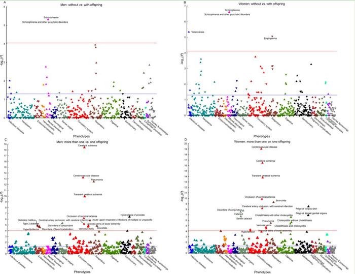 After excluding diseases with fewer than 30 cases to ensure adequate statistical power, 568 diseases for men and 654 diseases for women were retained for PheWAS analysis. The PheWAS results, corrected for multiple testing using the Bonferroni method, revealed that having no biological offspring was strongly associated with an increased risk of schizophrenia in both men and women. Moreover, having more than one offspring compared to one was associated with disease risks across multiple systems.