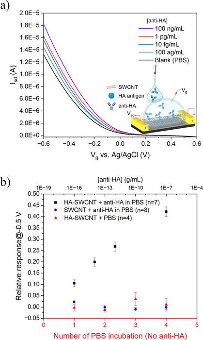 Detection of anti-hemagglutinin (anti-HA) antibody in PBS. (a) FET characteristic curves of a HA-SWCNT FET device upon exposure to an increasing concentration of anti-HA antibody in PBS. (b) Calibration plot for anti-HA detection in PBS (black), testing different concentrations of anti-HA on the nonfunctionalized SWCNT FET sensor chip as a control experiment (blue) and the effect of multiple incubation of the blank on the FET sensor (red). All data points plotted in the calibration plots are mean ± standard error. The number of devices (n) used for sensing is indicated in the parentheses in the legend.