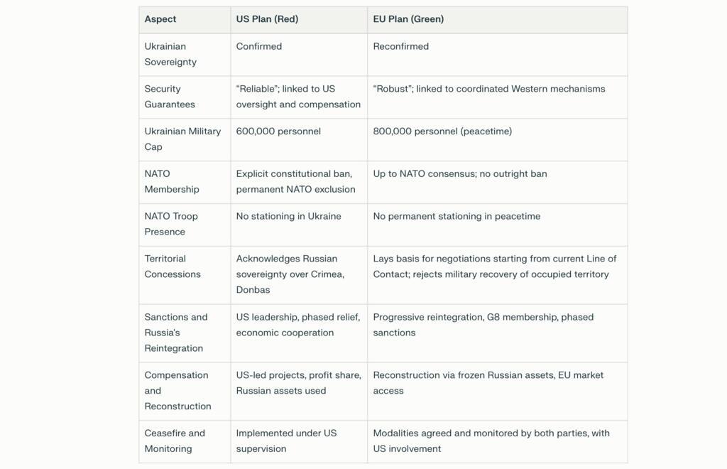 It allows Ukraine to keep a larger standing army (up to 800,000), and does not bar NATO membership outright – opting instead for “robust” coordinated security guarantees that could evolve with future alliances and consensus.