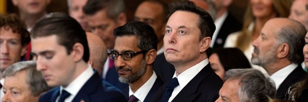 Google CEO Sundar Pichai and Elon Musk attend the inauguration of Donald Trump at the US Capitol Rotunda on January 20, 2025 in Washington, DC.