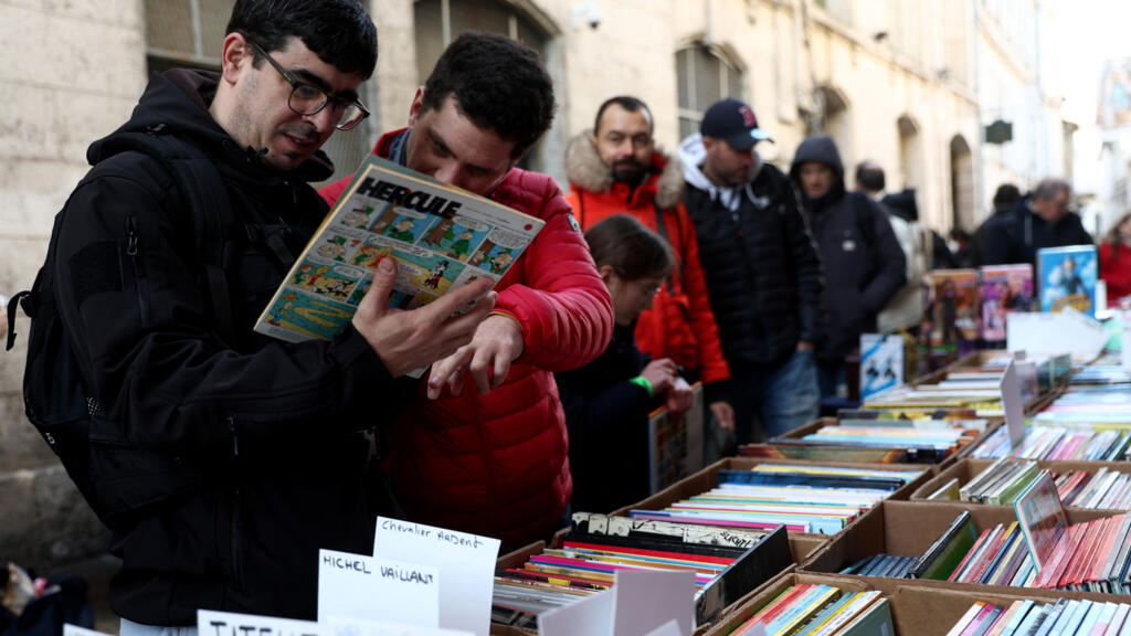 Visitors look at comics on the street during the 52nd Angouleme International Comics Festival in Angouleme, on January 30, 2025. AFP - ROMAIN PERROCHEAU
