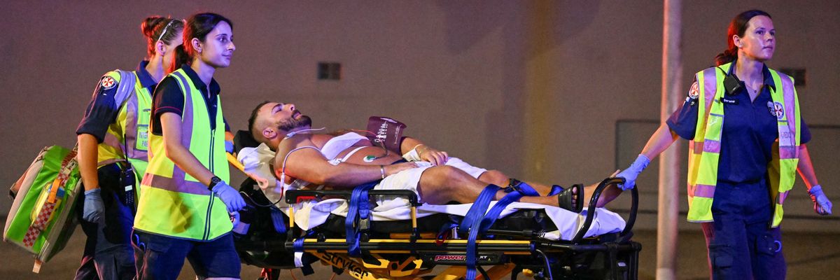 Health workers move a man on a stretcher to an ambulance after a shooting at Bondi Beach in Sydney, Australia on December 14, 2025.