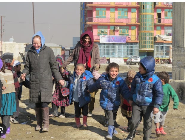 Kathy Kelly with children in Kabul, Afghanistan, May 2016 (Provided photo)