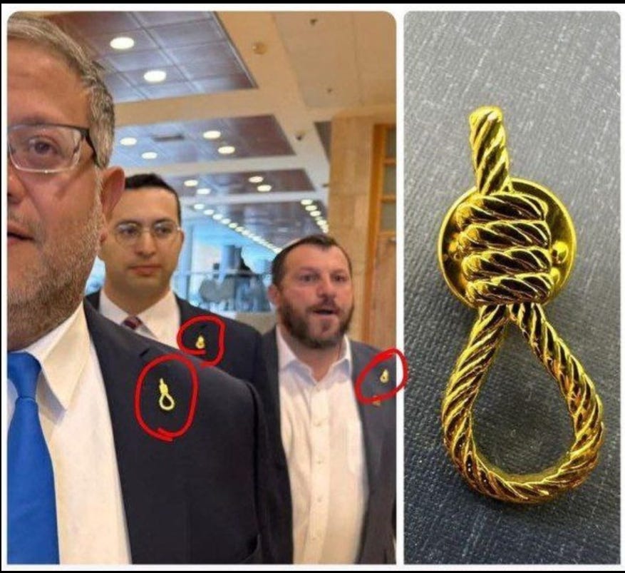 Israeli occupation Far-Right Lawmakers Spark Outrage by Wearing Noose-Shaped Pins Ahead of Debate on Executing Palestinian Prisoners.