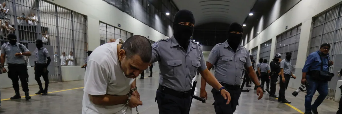 A man is escorted by a CECOT guard on February 6, 2024 in San Vicente, El Salvador.