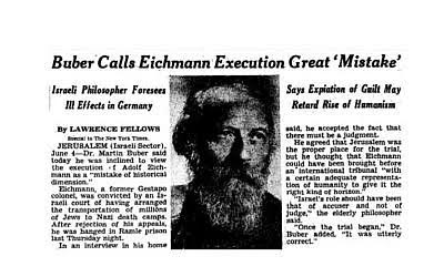 Image: Headlines of the June 5, 1962 New York Times article about Martin Buber’s objections to the execution of Nazi perpetrator Adolph Eichmann.