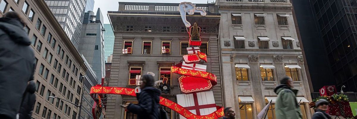Holiday crowds begin to gather in a shopping district at Rockefeller Center on the afternoon before Thanksgiving on November 26, 2025, in New York City.