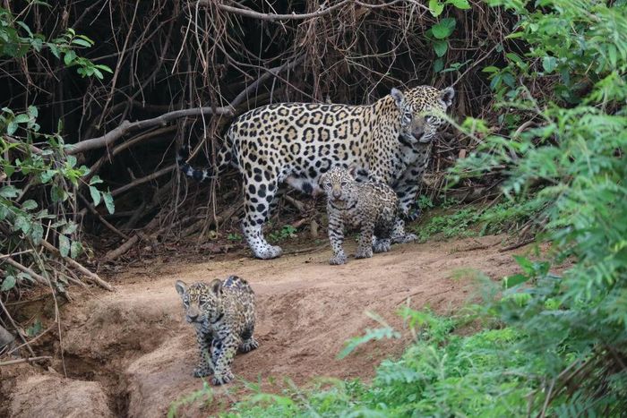 A jaguar and cubs are seen in Corixo Negro, Encontro das Aguas State Park. (Photo by April Kelly)