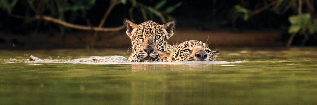 A six-month old jaguar cub rides on his mother’s back as she fords a stream in Pantanal, Brazil.