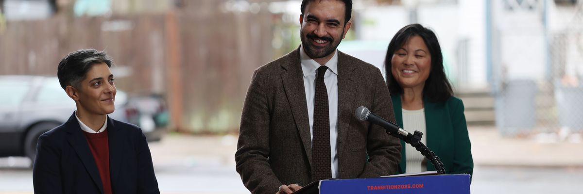 New York City Mayor-elect Zohran Mamdani stands beside Julie Su, his pick for deputy mayor for economic justice, and, further away, Deputy Mayor for Housing nominee Leila Bozorg, during a December 19, 2025 press conference in Staten Island.