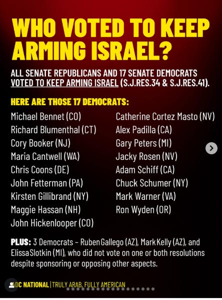 Yet, the other senator, Ron Wyden (D-OR), voted with all Republicans against stopping the military killing materiel to Israel.