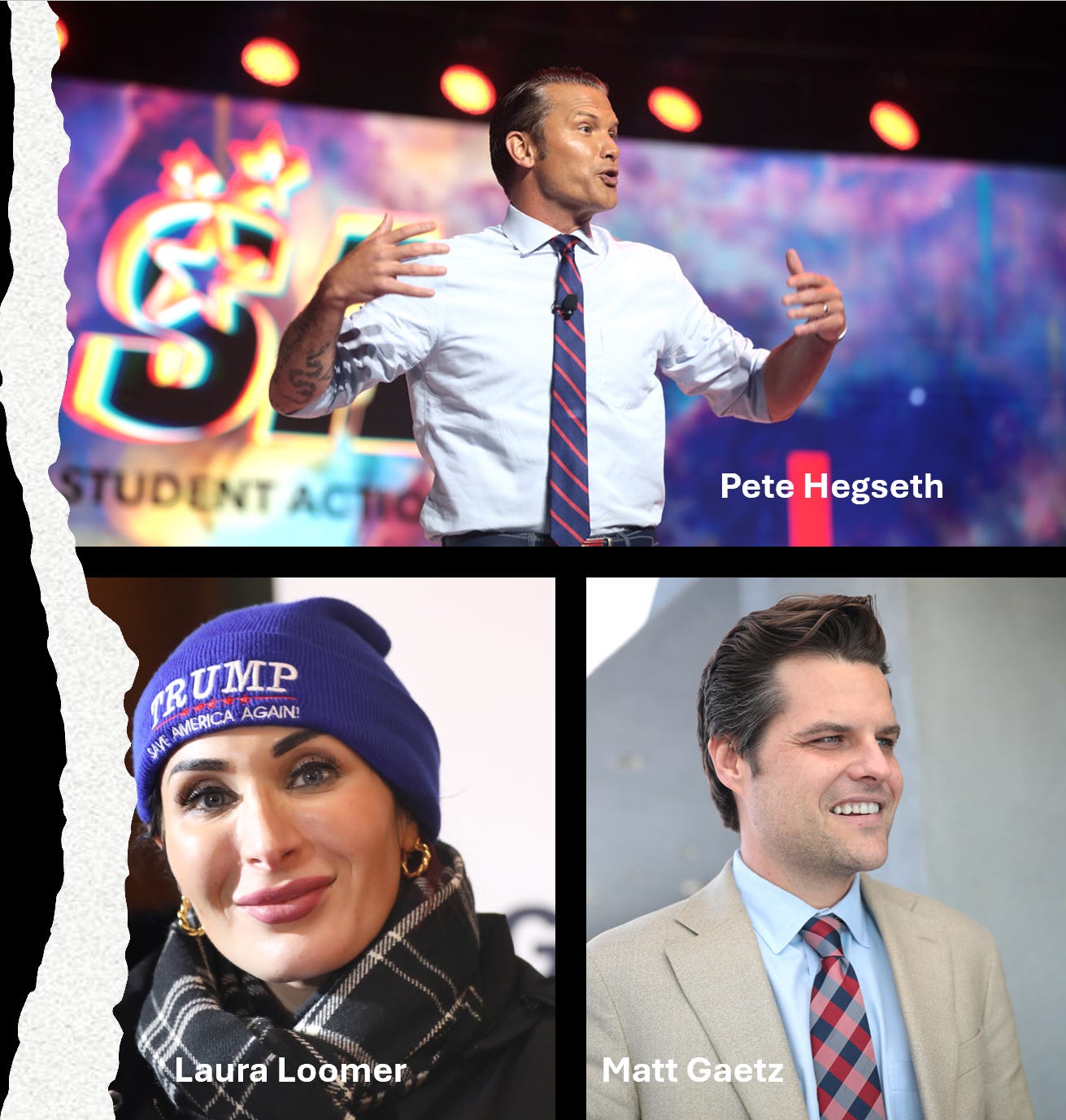 Image Information: (Top)“Pete Hegseth” by Gage Skidmore is licensed under CC BY-SA 2.0; (Left) “Laura Loomer by Gage Skidmore (cropped)” by Gage Skidmore is licensed under CC BY-SA 3.0. (Right) “Matt Gaetz” by Gage Skidmore is licensed under CC BY-SA 2.0.