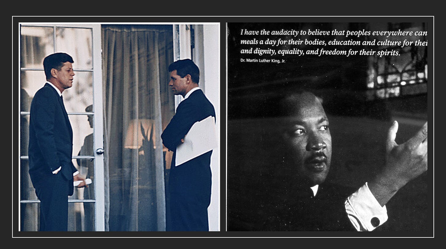 Image information: (Left) “Public Domain: JFK with RFK Outside Oval Office by Robert Knudsen, March 1963 (NARA)“ by pingnews.com is marked with Public Domain Mark 1.0.(Right) “MLK Photo and Quote“ by mattlemmon is licensed under CC BY-SA 2.0.