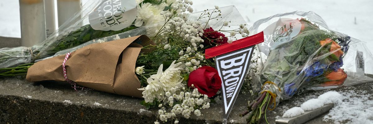Flowers and candles are seen at a makeshift memorial outside the Barus & Holley engineering building on the campus of Brown University, in Providence, Rhode Island on December 14, 2025. US authorities on Sunday detained a person of interest in the mass shooting at Brown University that left two people dead and nine others wounded, the latest in a long line of school attacks nationwide.
