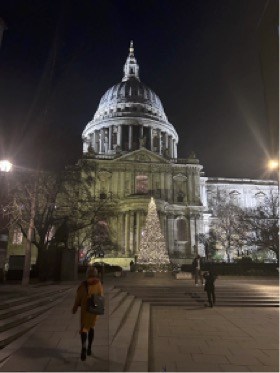 After the show, we walked across the Millennium Footbridge over the Thames towards St. Paul’s. One of the skyscrapers nearby was crowned by a green neon Christmas tree decked with blinking snow. It was nearly 60 degrees Fahrenheit at 10 at night in December: downright summery.